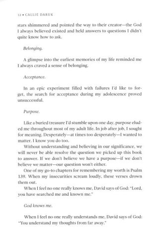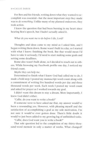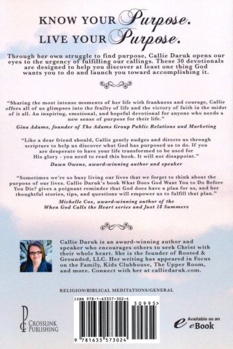 Through her own struggle to find purpose, author Callie Daruk opens our eyes to the importance and urgency of fulfilling our callings. Her thought-provoking reflections cause you to look into your own heart and stir you to ask for yourself the question we should all be asking, What Does God Want You to do Before You Die?