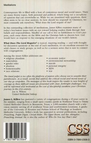 Contemporary life is filled with a host of contentious moral and social issues. There are many thorny topics, both personal and political, which bring out a cacophony of opinions that can overwhelm us. While we are inundated with questions, there often seem to be no clear answers. So how should we respond? As Christians, we must constantly ask ourselves, What does the Lord require of me?In this outstanding collection of meditations, James Killen examines many of today's hot-button issues with an eye toward helping readers think through their beliefs and responsibilities. Mindful of our call to live in faithfulness to God's purpose, each essay draws on the Bible and the Christian faith to discern how God would have us respond to the emerging situations of our world's history.What Does The Lord Require? is topical, inspiring reading — and with thoughtful discussion questions at the end of each meditation, it's an excellent resource for adult classes or study groups, as well as for a sermon series that is sure to connect with congregations.Among the issues addressed are: * religious pluralism* economic justice* materialism* environmental stewardship* gender roles* suicide* abortion* personal integrity* homosexuality* AIDS* race relations* warThe timid pulpit is too often the platform of pastors who choose not to unsettle their parishioners. As a result, words that address the critical social and moral issues of our day go unspoken. The messages of this book inspire the reader to new heights of courage as these difficult issues are presented with clear, forthright challenges. You will be informed and motivated as the cost of discipleship awakens your Christian journey in the 21st century.Joe A. WilsonUnited Methodist bishopJames Killen does a remarkable job of reminding us that being a Christian is more than individual religiosity. Rather, it encompasses every facet of our existence, personal and corporate. These meditations explore issues that Christians cannot afford to ignore. A must read Brig. Gen. Hiram Doc Jones, USAF (retired)Former Deputy Chief, Air Force Chaplain ServiceJames L. Killen has pastored a variety of congregations during a 45-year career in the ministry, ranging from a small open country parish in northeast Texas to Trinity United Methodist Church in Beaumont, Texas, a 2,000-member church with a television ministry serving all of southeast Texas and southwestern Louisiana. A graduate of the University of Houston and Perkins School of Theology at Southern Methodist University, Killen's work has appeared in several publications, including Preaching, Pulpit Digest, Circuit Rider, The Upper Room, and the Abingdon Preaching Annual. He is also the author of Who Do You Say That I Am?