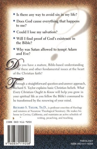 Is there any way to avoid sin in my life?Does God cause everything that happens to me?Could I lose my salvation?Will I find proof of God’s existence in the Bible?Why was Satan allowed to tempt Adam and Eve?Do you have a mature, bible-based understanding of these and other fundamental issues at the heart of the Christian faith?Through a straightforward question and answer approach, Richard S. Taylor explains basic Christian beliefs in What Every Christian Ought to Know. This book will help you grow in your spiritual life as you follow the command to ’be transformed by the renewing of your mind’ (Rom. 12:2).