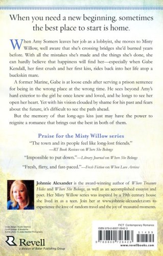 When Amy Somers loses her job as a lobbyist, she moves to Misty Willow, well aware that she's crossing bridges she'd burned years before. With all the mistakes she's made and the uncaring things she's done–even to her own family–she can hardly believe that happiness will find her, especially when Gabe Kendall, her first crush and her first kiss, rides back into her life atop a buckskin mare.