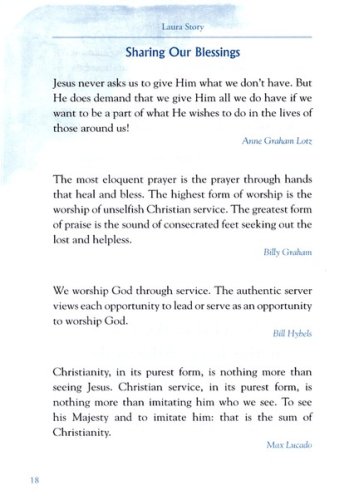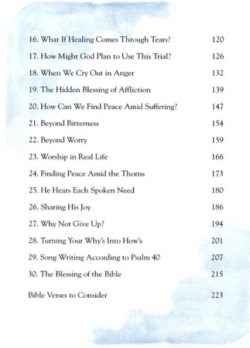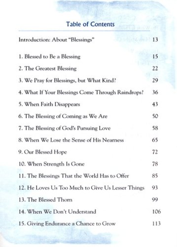 These 30 daily devotions will guide you into a deeper understanding of God's mysterious use of Blessings. Chapter Titles include, What If Your Blessings Come Through Raindrops? (a signature line in the song), and He Loves Us Too Much To Give Us Lesser Things. Each chapter contains thoughts, prayers and quotes along with a journaling page for you to recall blessings you have seen in your own life.