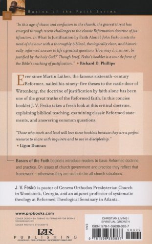Ever since Martin Luther, the famous sixteenth-century Reformer, nailed his ninety-five theses to the castle door of Wittenberg, the doctrine of justification by faith alone has been one of the great truths of the Reformed faith. In this concise booklet, J. V. Fesko takes a fresh look at this critical doctrine, explaining biblical teaching, examining classic Reformed statements, and answering common questions.