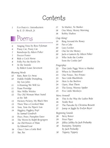 • Favorite poems and rhymes—all beautifully illustrated, to be read and recited together, from Robert Louis Stevenson’s "At the Seaside" to limericks by Edward Lear and tongue twisters by Jack Prelutsky, plus fun "clap along!" and "fingerplay" verses that parents and children can act out together