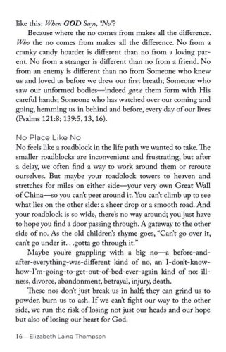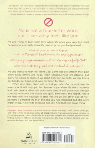 Author Elizabeth Laing Thompson walks alongside readers as she tackles the difficulties that stymie our faith, stifle our prayers, and stunt our relationship with God. When God Says, "No" will help you to discover hope when life feels hopeless, good in what feels bad, and new dreams when old ones have died. This book is a fantastic reminder of Who is in charge—Who He is and how He works. How He loves us and why He limits us. The better we know Him, the more we understand that He says "No" to a few things, so He might say "Yes" to many more.