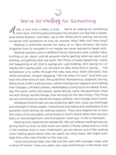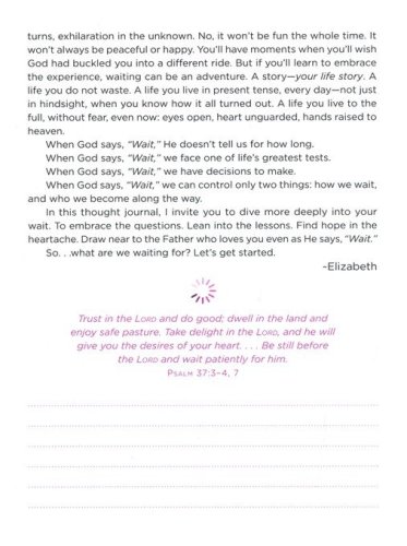 Author Elizabeth Laing Thompson invites you to journal through your personal "wait" and come out on the other side with your faith, relationships, and sense of humor intact.