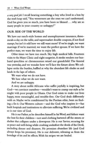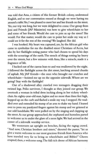 Joni Eareckson Tada, a woman who has lived in a wheelchair for more than thirty years, and Steve Estes, a pastor and one of Joni's closest friends, explore the answers. When God Weeps is not so much a book about suffering as it is about God. It tackles tough questions about heaven and hell, horrors and hardships, and why God allows suffering in this life.