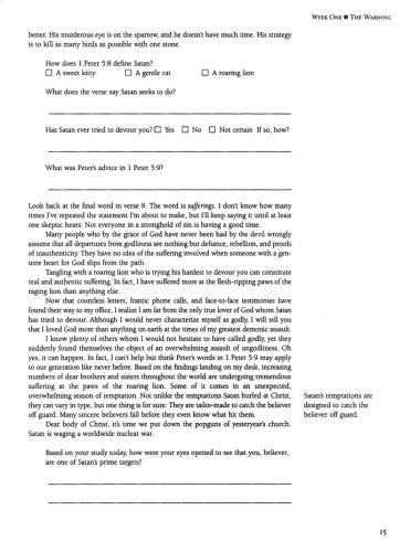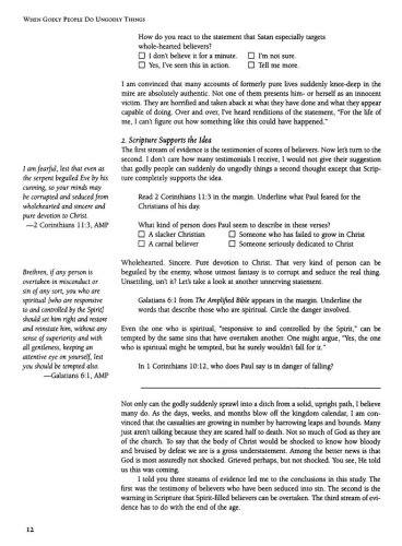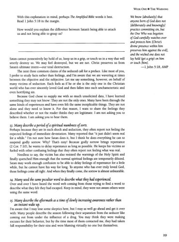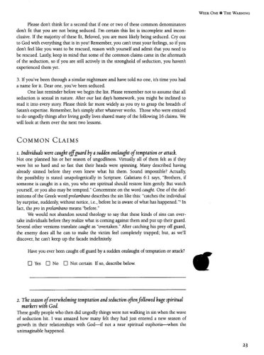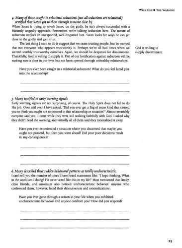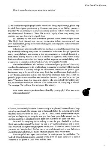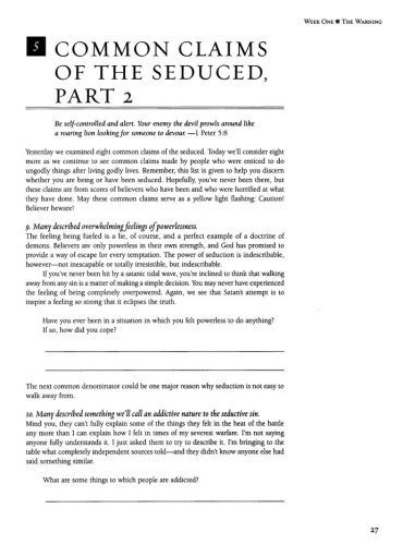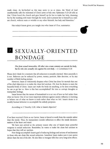 Believers are still subject to Satan's attacks. He is determined to disrupt the lives of Christians, destroy their ministry, and steal their joy. Sadly, those who have "fallen" may not recognize the devil's schemes until they have already been caught in a snare of defeat. This six-week study is written in three parts. The first part is a warning to believers, while the second part shows women how to prepare for attacks by the Enemy. The third part is directed to those who have been snared by seduction, and compassionately points the way back to God.
