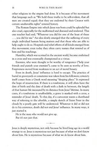 His vision of life continues to haunt and challenge humanity. His influence has swept over history bringing inspiration to what has happened in art, science, government, medicine, and education; he has taught humans about dignity, compassion, forgiveness, and hope.