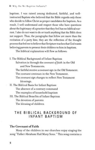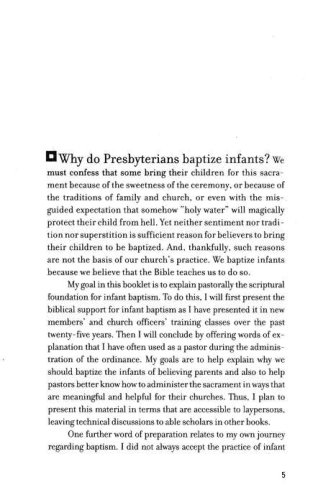 “My goal in this little book is pastorally to explain the scriptural foundation for infant baptism. To do this, I will first present the biblical support for infant baptism as I have presented it in new members’ and church officer training classes over the past twenty-five years. Then I will conclude by offering words of explanation that I have often used as a pastor during the administration of the ordinance. My goals are to help explain why we should baptize the infants of believing parents and also to help pastors better to know how to administer the sacrament in ways that are meaningful and helpful for their churches. Thus, I plan to present this material in terms that are accessible to laypersons and to leave technical discussions to able scholars in other books.”