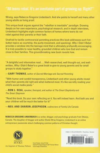 Rather than provide step-by-step instructions on how to construct the perfect family, Lindenbach tells her own story and the stories of others as examples of what went right, inviting readers to think differently about parenting. Addressing hot-button issues such as courtship, the purity movement, and spanking–and revealing how some widely–held beliefs in the Christian community may not actually help children–Why I Didn’t Rebel provides an utterly unique, eye-opening vision for raising kids who follow God rather than the world.