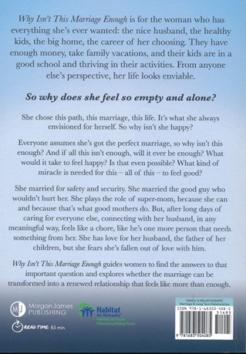 Why Isn't This Marriage Enough? is for the woman who has everything she's ever wanted: the nice husband, the healthy kids, the big home, the career of her choosing. So why does she feel so empty and alone? This book guides women to find the answers to that important question and explores whether the marriage can be transformed into a renewed relationship that feels like more than enough.