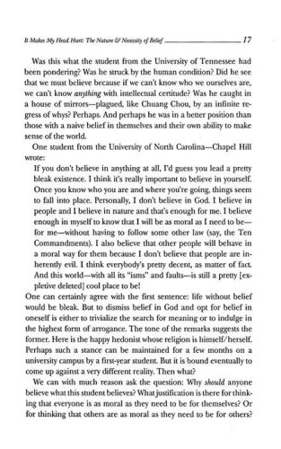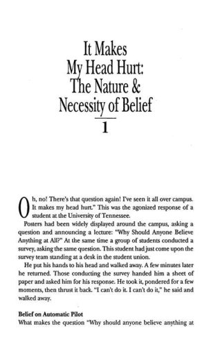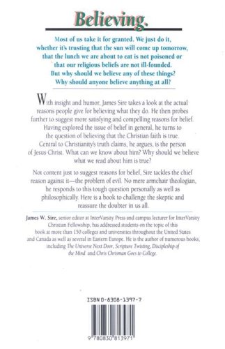 Believing. Most of us take it for granted. We just do it–whether it's trusting that the sun will come up tomorrow, that the lunch we are about to eat is not poisoned or that our religious beliefs are not ill-founded. But why should we believe any of these things? Why should anyone believe anything at all? With insight and humor, James W. Sire examines the reasons people give for believing what they do and suggests what are truly satisfying and compelling reasons for belief. He then turns to the question of a specific belief–namely, belief that the Christian faith is true. Sire tackles both the best reason for belief in Christianity (the identity of Jesus ) and the chief reason against it (the problem of evil). And he responds to these issues personally and philosophically. Here is a book to challenge the skeptic and reassure the doubter in us all.