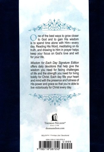 Billy Graham touched millions of lives by sharing the truth of the gospel, and now you are invited to live a wisdom-filled life every day with this inspirational daily devotional, Wisdom for Each Day Signature Edition. Although Billy Graham preached to millions of people, his message was personal to each of us: Christianity is about having a relationship with God through faith in Jesus. In Wisdom for Each Day, you'll find 365 devotions and scripture to help nurture and strengthen that relationship.