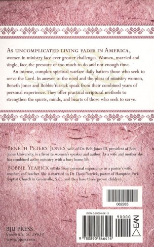 A practical and helpful guide for Christian women! Whether you're a pastor's wife or a single woman serving the Lord you'll find great advice on organizing tasks at home, entertaining and hospitality, public speaking, personality conflicts and communication, women's retreats and many others. Learn to make the most of your resources and equip yourself for better service. 281 pages, softcover from Journeyforth.