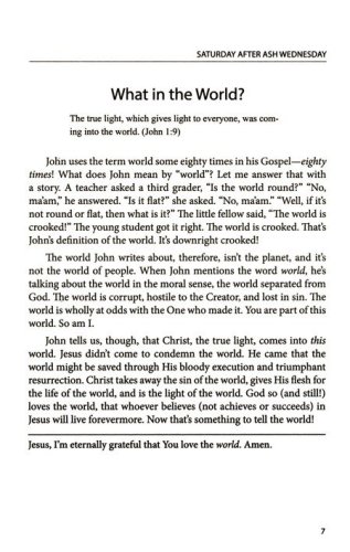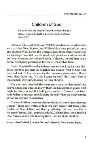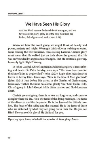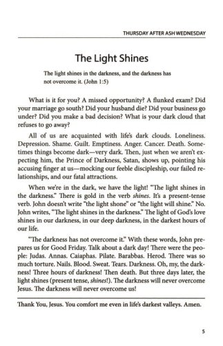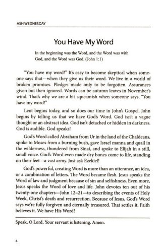 Each year Christians observe the season of Lent as they follow Jesus and await His entrance into Jerusalem. This daily devotional begins on Ash Wednesday and prepares readers as they journey through Lent and await His impending crucifixion. Use this devotional to track each day of Lent before it ends on Easter Sunday. Strive to learn and grow in God's word as you follow His son during this important time. 56 pages, softcover, from Concordia.