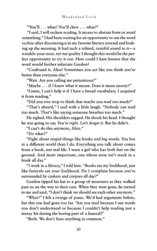 Alice Grace Ripley lives in a dream world, her nose stuck in a book. But happily-ever-after life she's planned on suddenly falls apart when her boyfriend, Gordon, breaks up with her, accusing her of living in a world of fiction instead of the real world. Then to top it off, Alice loses her beloved job at the library because of cutbacks due to the Great Depression.