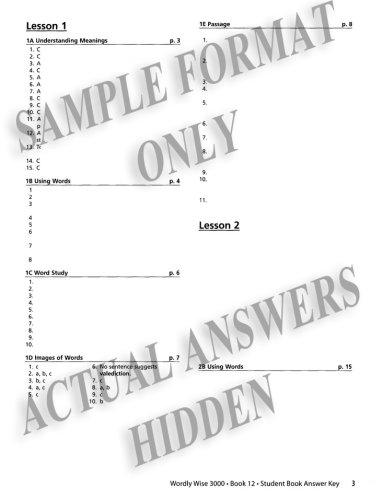 This answer key accompanies the sold-separately Wordly Wise 3000, Book 12, 3rd Edition. Answers for each lesson are included; passages are given full-sentence answers and puzzle/hidden message exercises are reproduced with the correct answers filled in. Paperback.