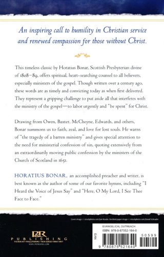 This timeless classic by Horatius Bonar, Scottish Presbyterian divine of 1808–89, offers spiritual, heart-searching counsel to all believers, especially ministers of the gospel. Though written over a century ago, these words are as timely and convicting today as when first delivered. They represent a gripping challenge to put aside all that interferes with the ministry of the gospel—to labor urgently and “be spent” for Christ.