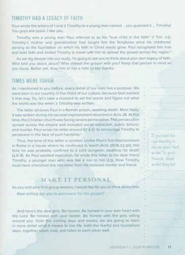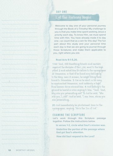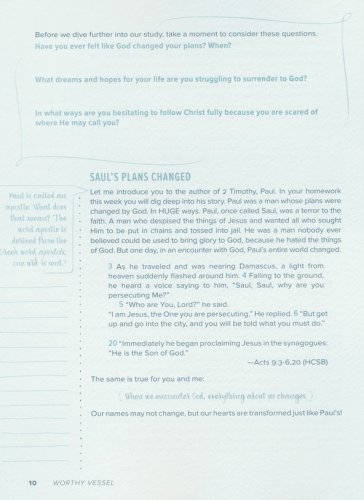 Provides an in-depth study of a book of the Bible that challenges girls in the discipline of daily Bible studyEach day of homework will guide girls as they learn to journal through an entire book of the BiblePersonal spiritual growth through individual time spent in Bible study with the contentGirls will discover what it means to be a "worthy vessel" of the gospelEmphasis on continuing in ministry despite hardshipsEncouragement for girls to invest in the spiritual growth of other believers; older girls pouring into younger girls