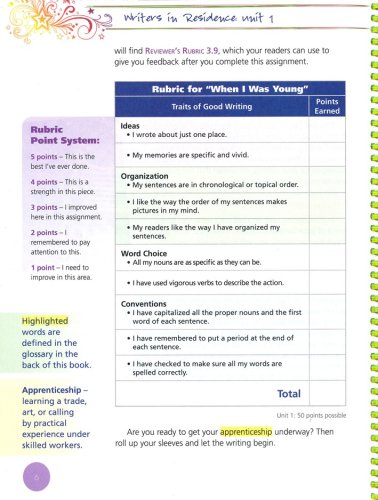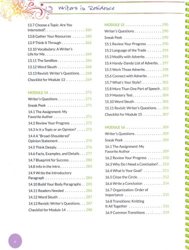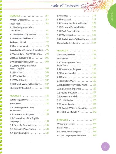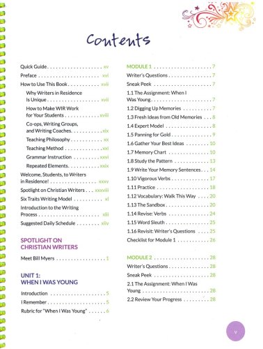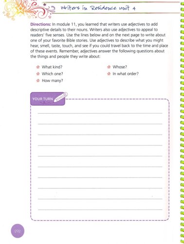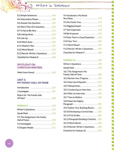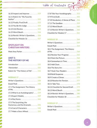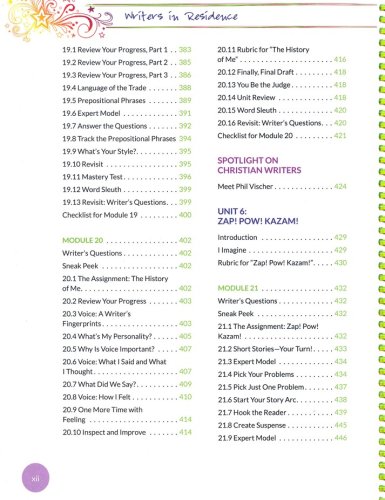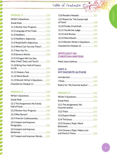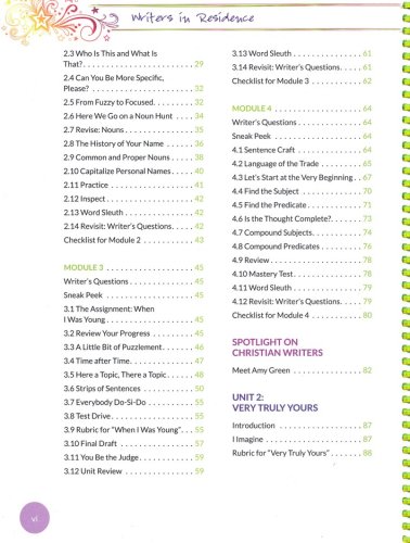 Thorough and systematic, six units and twenty-four modules are included, with lively and colorful lessons building on previously-taught concepts, skills, and terms. The easy-to-use, "all-in-one" Student Text and Workbook features an engaging tone that's written directly to the student. Each unit opener includes a focus on a Christian writer, unit overview, and rubric; units include models from professional writers for students to study and use as an inspiration for their own writing. Modules integrate clear, engaging instruction with sidebar notes and a variety of exercises.