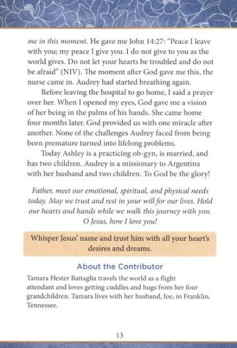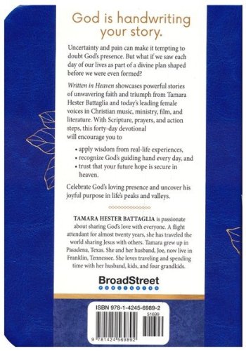 Written in Heaven showcases powerful stories of unwavering faith and triumph from Tamara Hester Battaglia and today’s leading female voices in Christian music, ministry, film, and literature. With Scripture, prayers, and action steps, this forty-day devotional will encourage you to