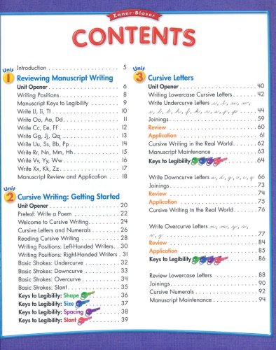 Zaner-Bloser Handwriting is a complete handwriting program that can be taught in as little as 15 minutes a day! The Zaner-Bloser style teaches a cursive alphabet that is made up of four basic strokes: the undercurve, downcurve, overcurve, and slant.