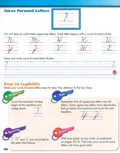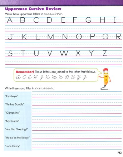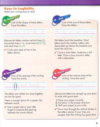 This third grade cursive workbook focuses on a review of manuscript writing and the transition to cursive. Colorful and engaging exercises include how to read cursive; tracing and writing individual letters, words, sentences, and numbers; and original writing exercises. Review and application exercises are included throughout. Students will think about shape, size, spacing and slant as the keys to legibility.