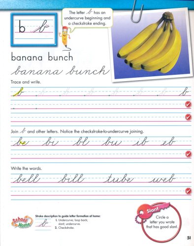 Letter models with arrows to show stroke sequence Green starting dots that show students where initial strokes begin on beginning models Stroke descriptions to guide letter formation at home Stop-and-check signs to remind students to self-evaluate their letters Space to practice writing directly beneath models (that both left-and right-handed students can easily see)